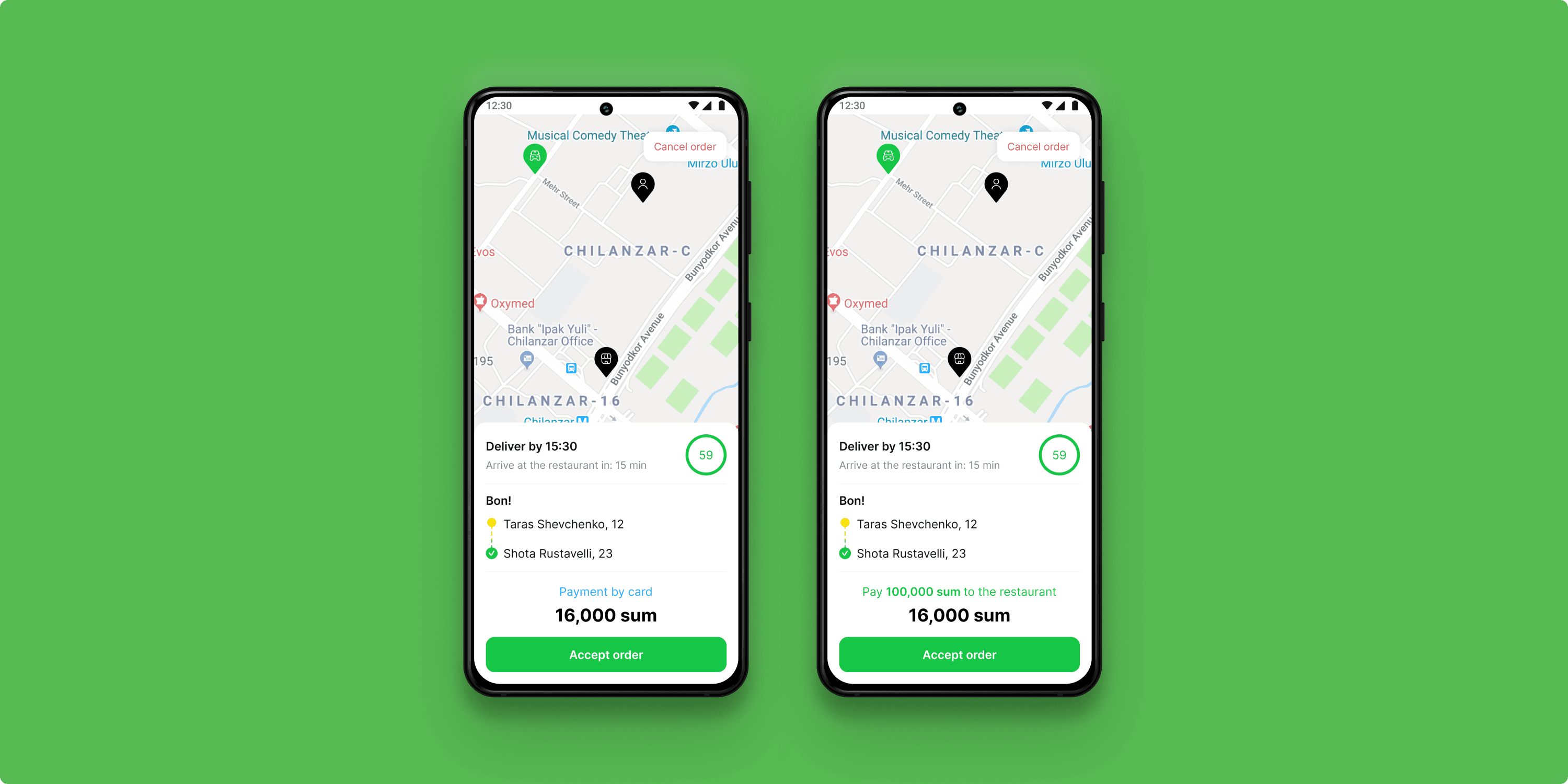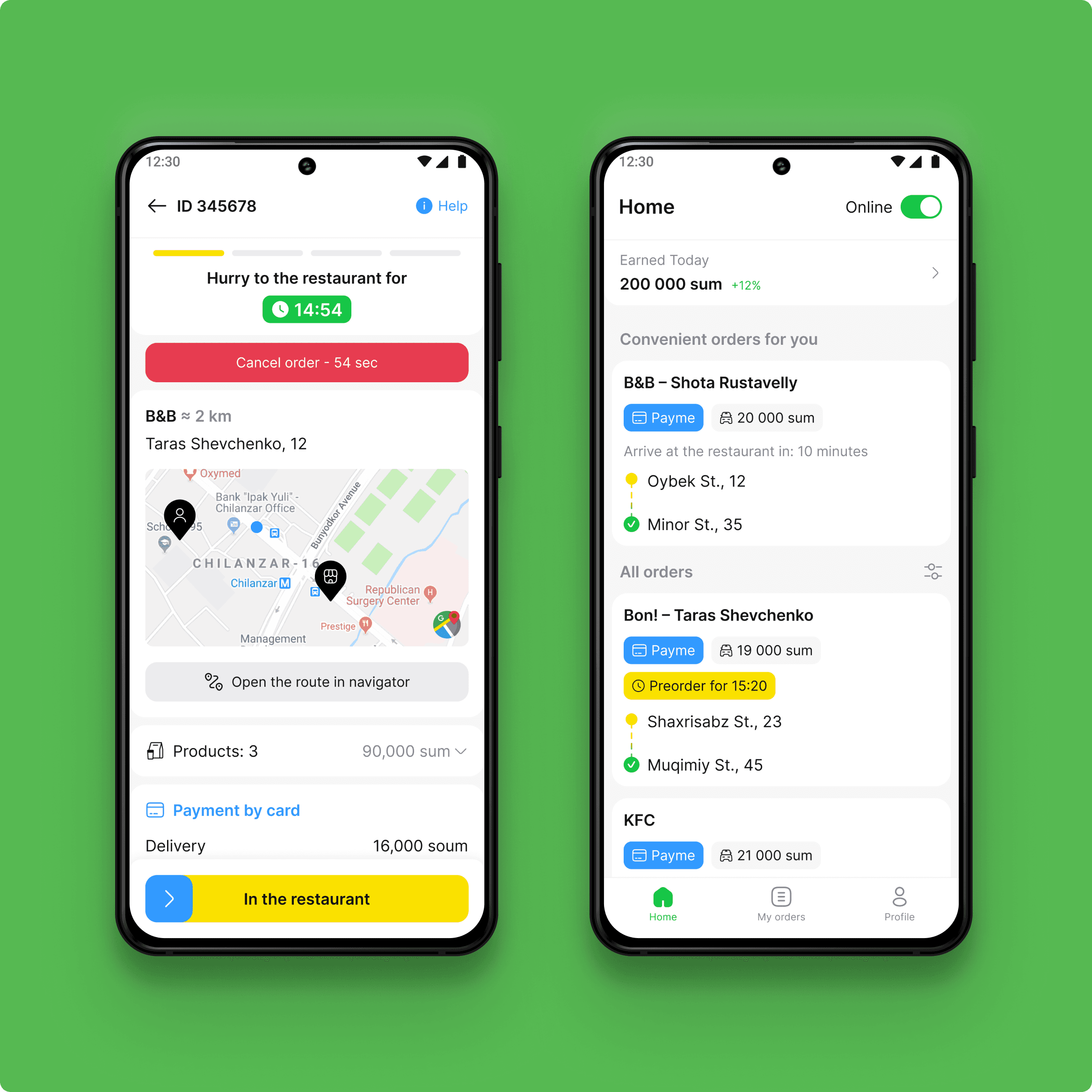 Essential information—including estimated time of arrival (ETA), pickup and drop-off locations, and delivery price—was prioritized to support faster decision-making. For cash orders, the screen displayed both the amount to be paid at the restaurant and the sum to collect from the customer. The layout was optimized for clarity and quick understanding, reducing cognitive load during active shifts.