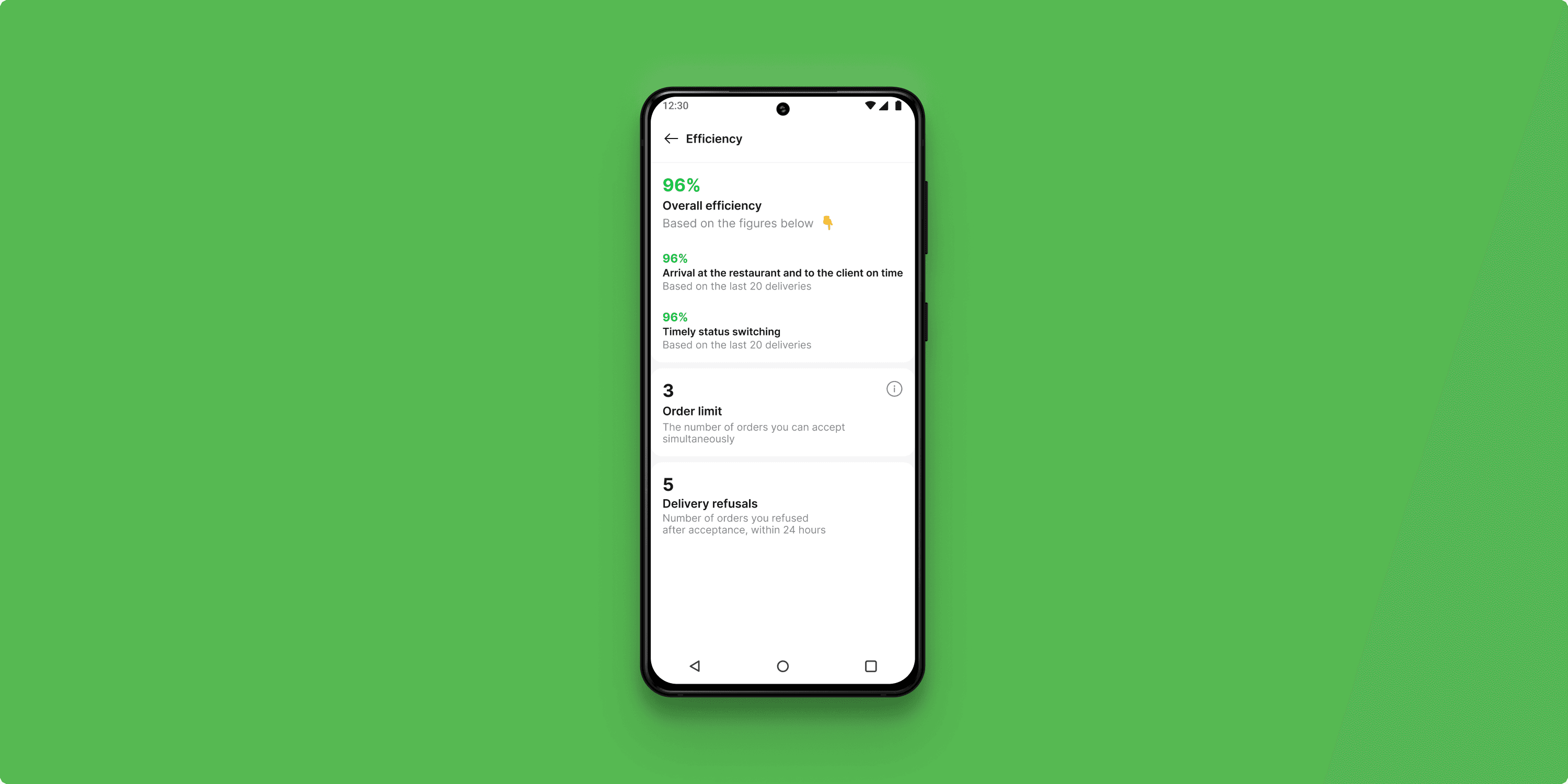 The Efficiency screen offers real-time visibility into a courier’s workload and capacity. It displays performance indicators that influence how many orders a courier can handle, helping users stay on track and optimize their shift output.