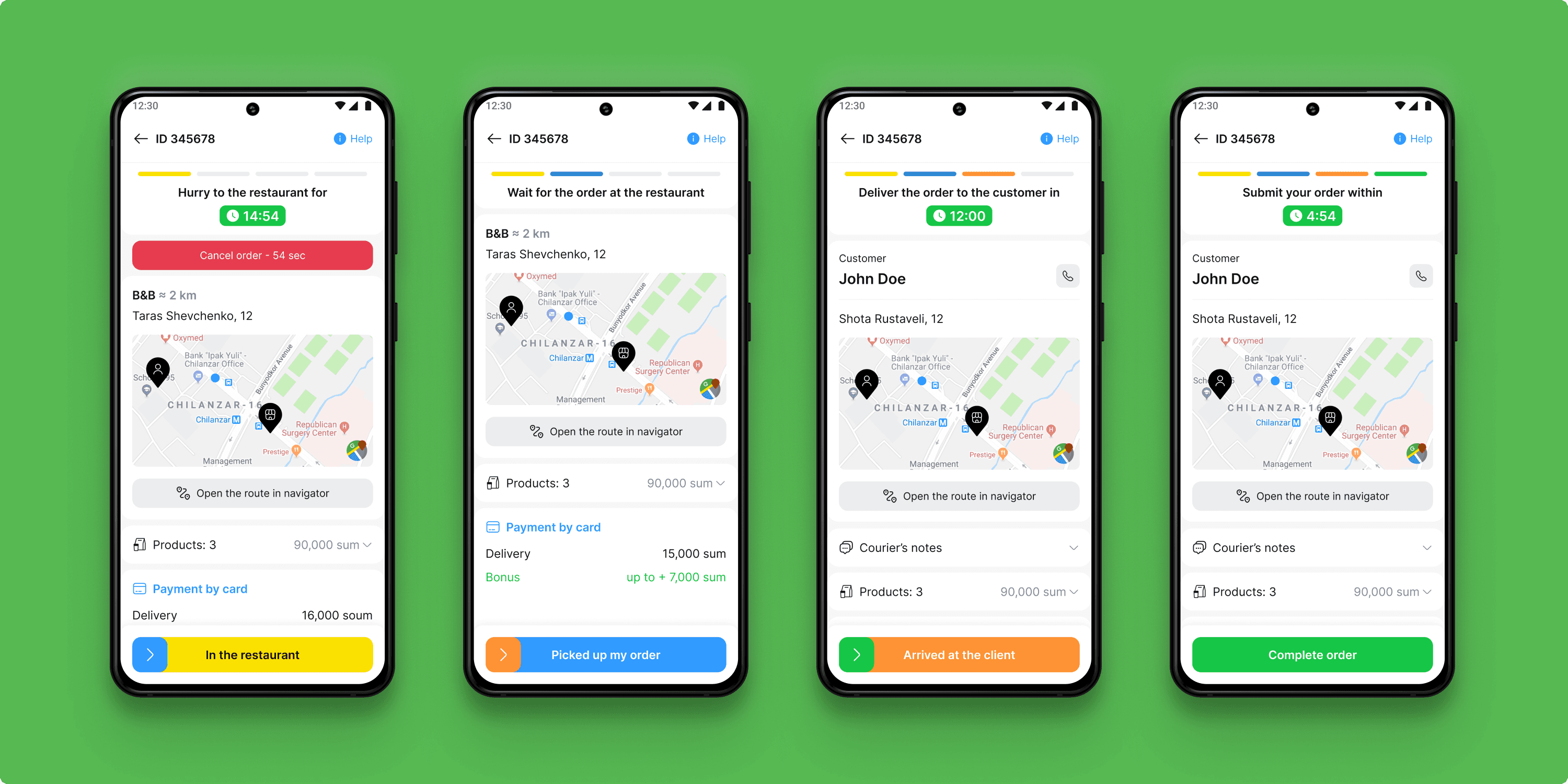 This screen guides couriers through each stage of the delivery process. Its content dynamically adjusts based on the order status, providing clear, step-by-step instructions. Each status is color-coded for intuitive recognition, while the primary action button allows couriers to update their progress with a single tap.