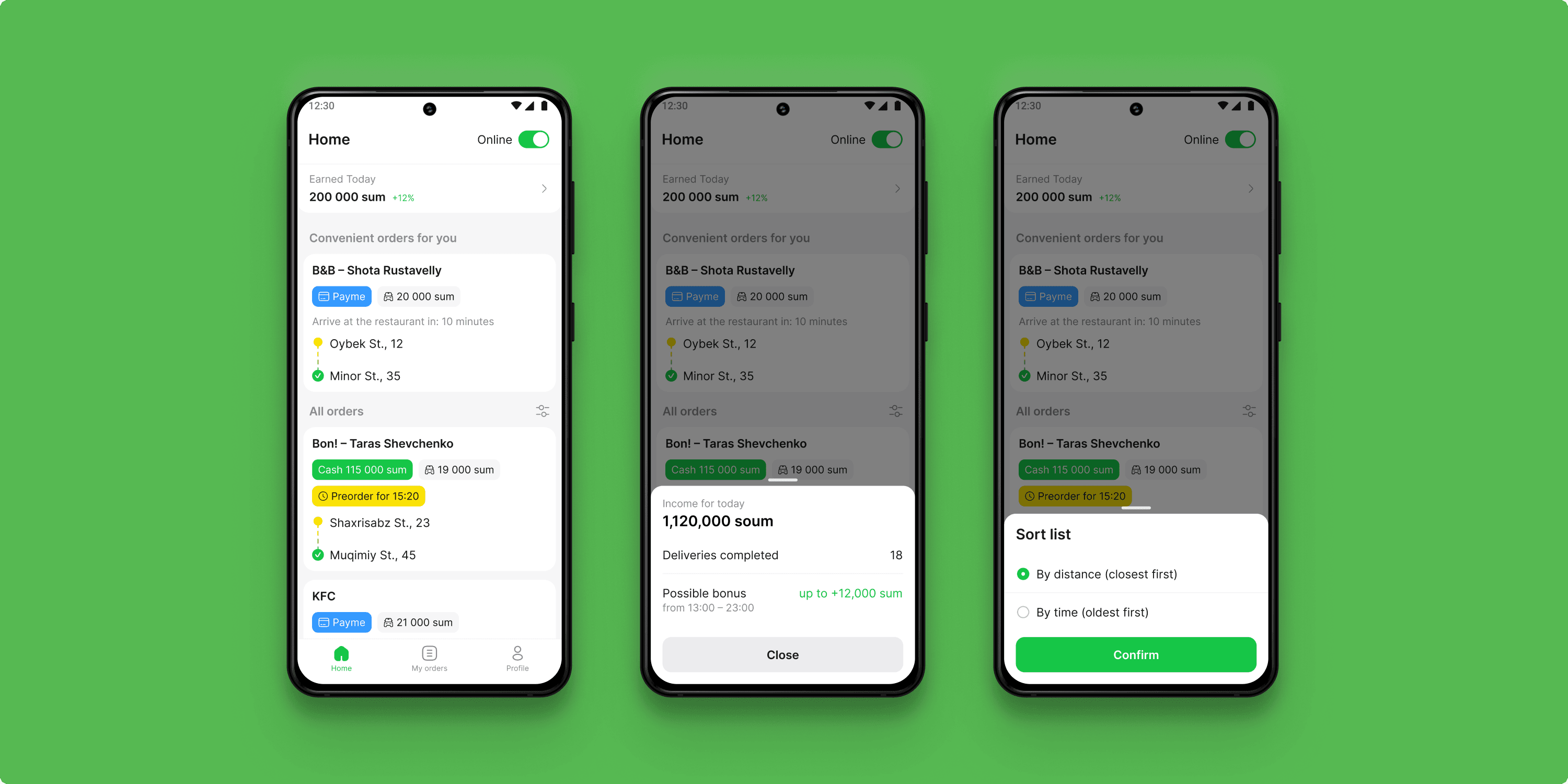 Based on user behavior, the home screen was divided into two sections: recommended orders and all other available orders. Courier status (online/offline) and order cards remained visible as usual. Order cards were reorganized and visually shortened for faster scanning. Additionally, a dedicated block showing daily work summaries was added to help couriers track their progress throughout the day.