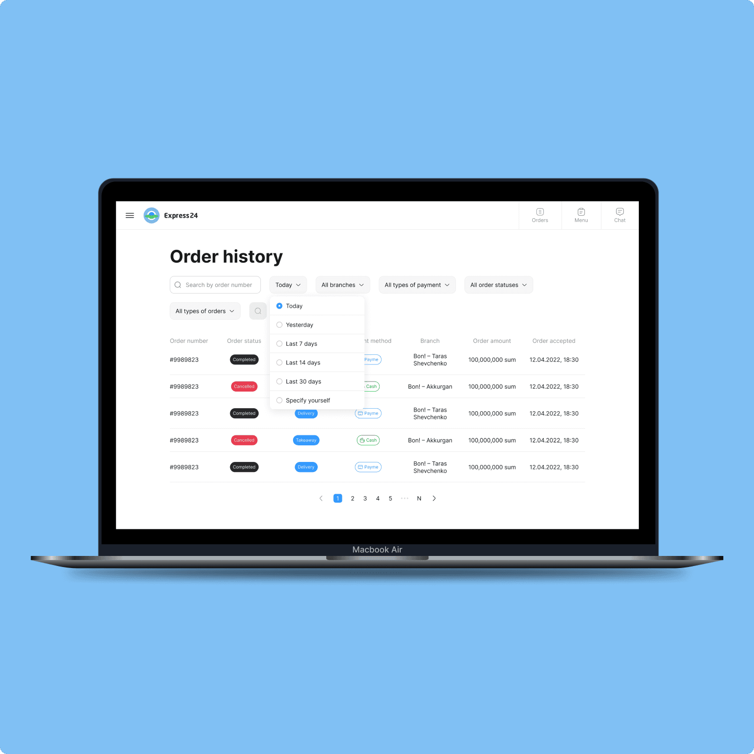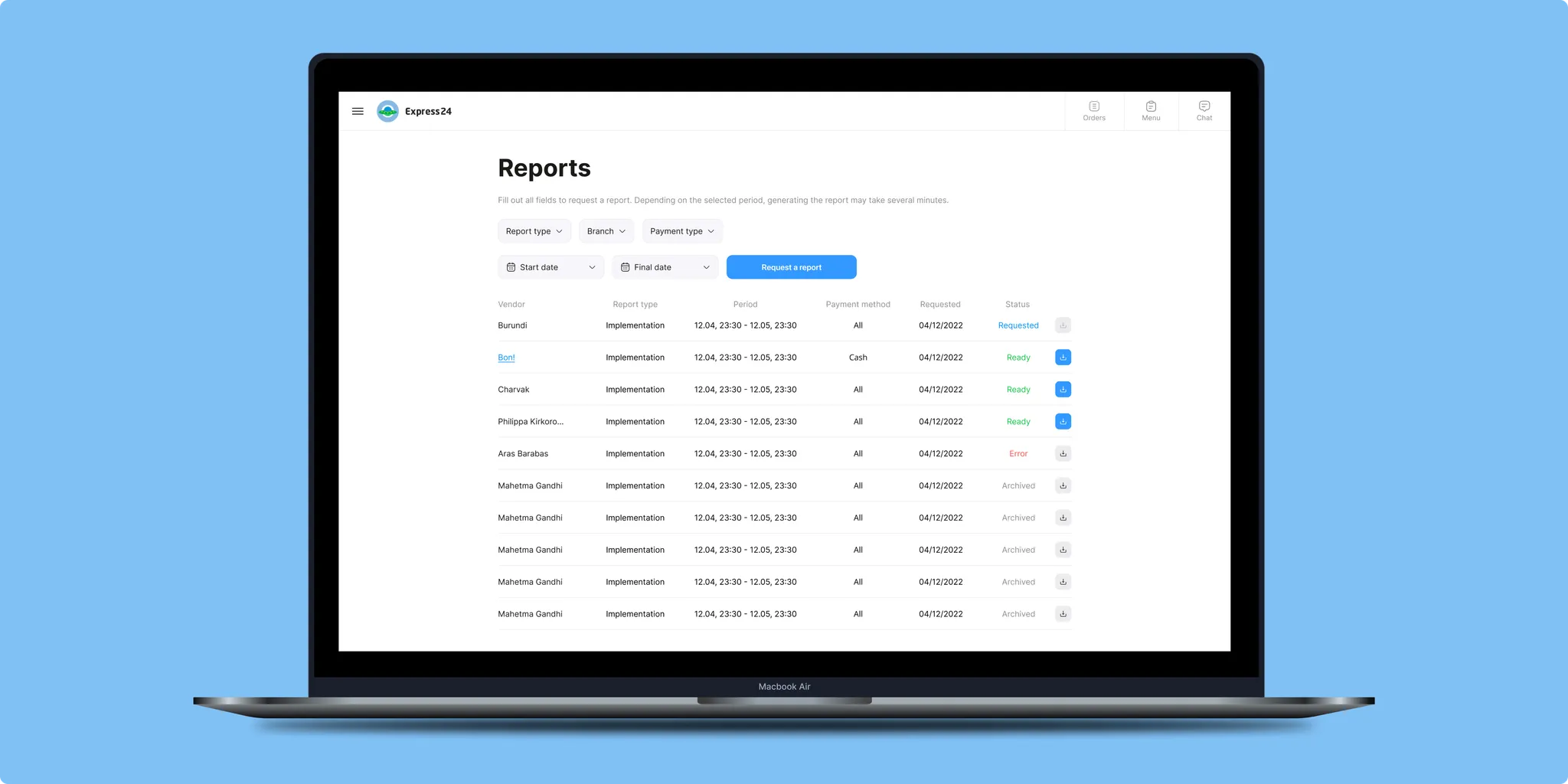 A unique “Reports” feature for accounting was also developed—some screenshots are provided below. For more details on the business goals of this project, please visit the Express 24 Merchant App.